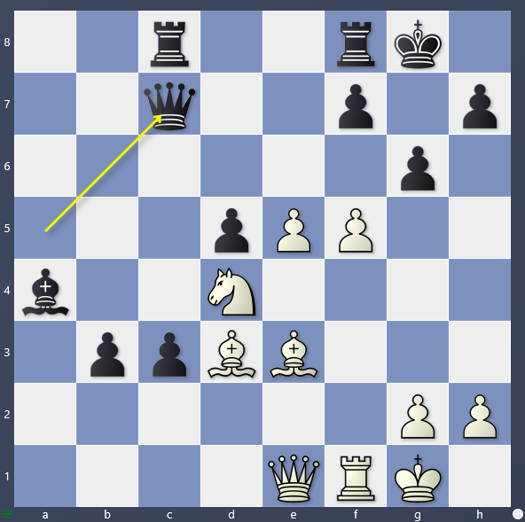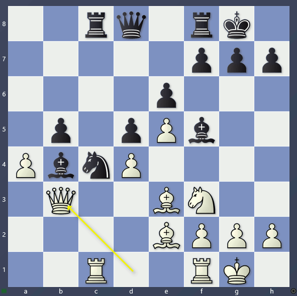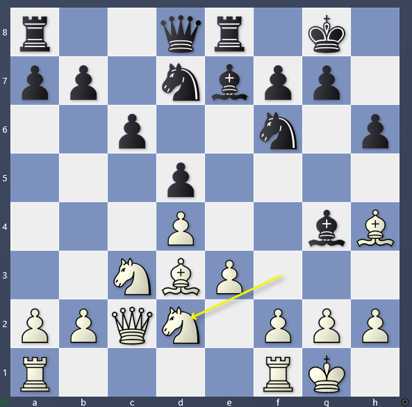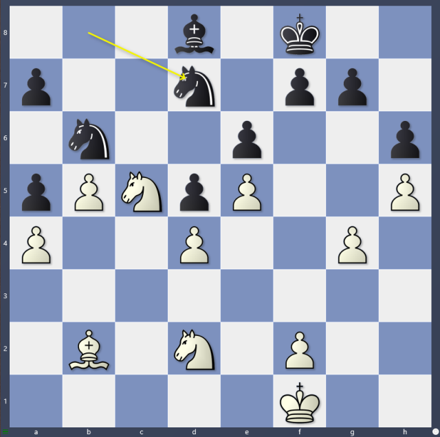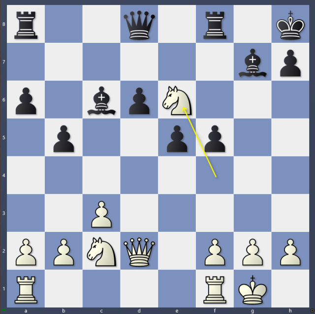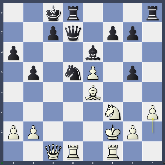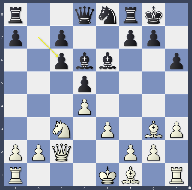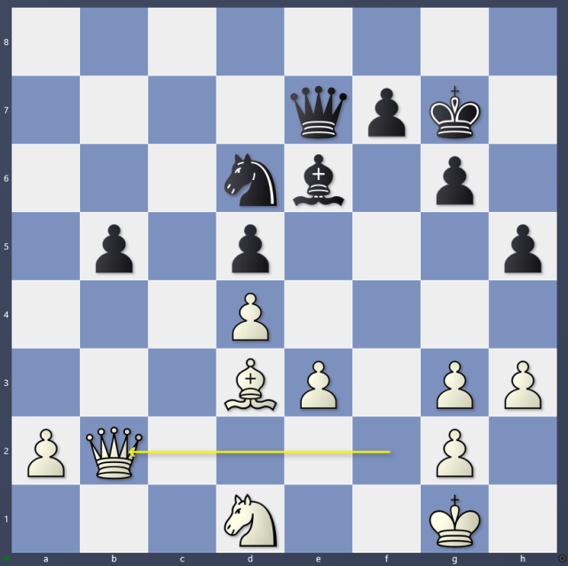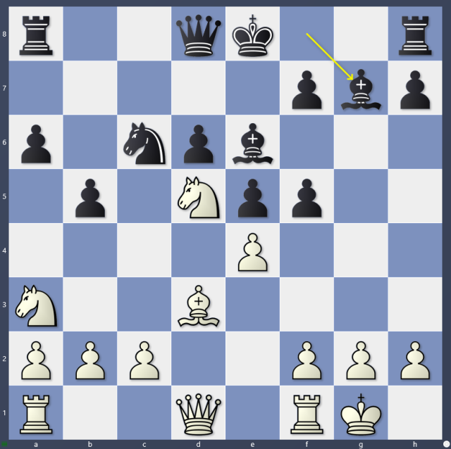 Ici, j’ai joué rapidement 13.Dd2? en croyant que c’était ma prépa ! (dans le premier blitz j’ai finalement choisi le correct 13.Dh5). C’est toujours difficile avec tellement de choses à mémoriser, mais juste après avoir joué ce coup, je me suis dit : « c’est bizarre, mais ça a l’air complètement idiot ». Et ça l’était ! Heureusement, Fabi n’a pas su en profiter, et m’a laissé une suite tactique forçant la nulle :