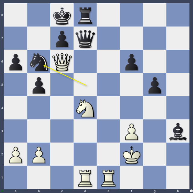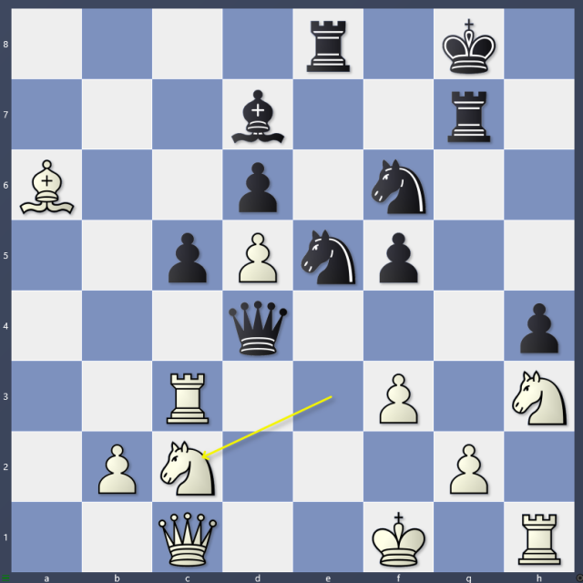 28.Cb5! (surtout pas 28.Dxf6? Dh7!, beaucoup trop dangereux) et la finale est gagnante après 28…Dxc6 29.Ca7+ Rb7 30.Cxc6 Txd1 31.Ca5+ Rc8 32.Txd1. J’aurais pu la convertir de façon plus efficace sans doute, mais à noter la grosse défense de sa part quand même.