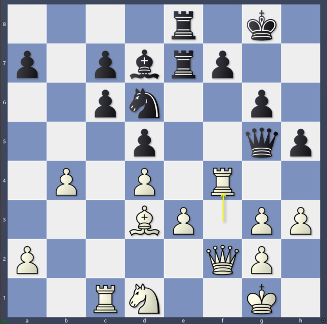 Nous sommes dans une ligne moderne de la variante d’échange du Gambit-Dame. Fabiano avait préparé ici la nouveauté 14.Fd3, acceptant le doublement des pions g. Je sais qu’il est coutumier des longues lignes « fait maison » et qu’il a une capacité à s’en souvenir remarquable. Mais là, il m’a quand même surpris en débitant tous ses coups pratiquement a tempo jusqu’à 23.Tf4 !