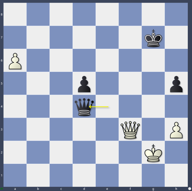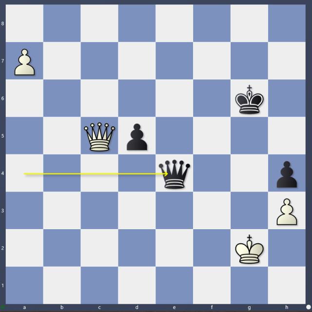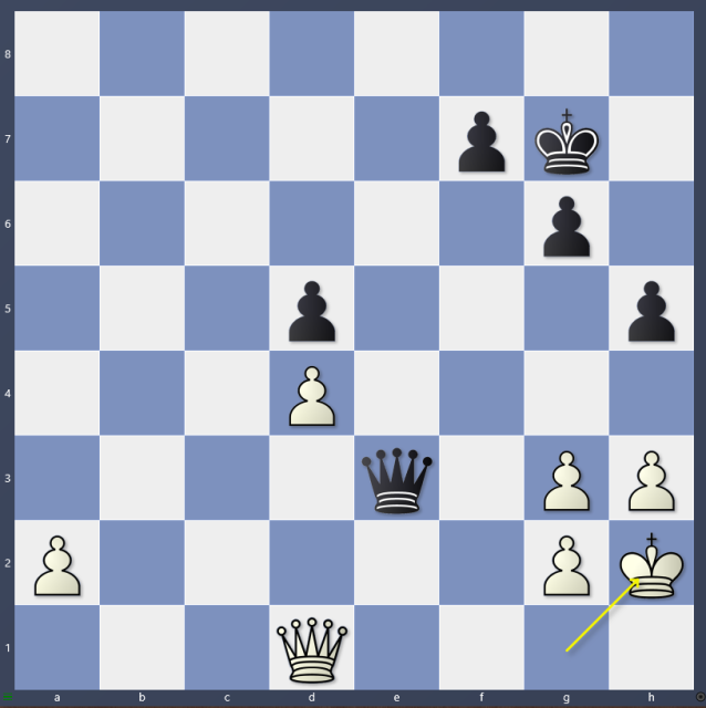 Objectivement, cette finale est nulle, mais avec les Dames, ce n’est jamais simple ! Surtout qu’il y avait plusieurs options ici. 36…Dc3 me semblait très passif après 37.h4 suivi de 38.a4, mais en fait je peux simplement laisser ma Dame en c3, puis attendre avec …Rg8-g7 et il ne peut pas progresser. C’était une décision difficile et je craignais qu’il y ait un chemin possible pour les blancs. Donc au final j’ai choisi une défense active, mais malheureusement pas la bonne, qui était 36…h4. Mais je ne l’ai pas sentie et il faut dire que ce n’est pas évident après 37.gxh4 Df4+ 38.Rg1 Dxh4 39.a4 ; pourtant la machine est formelle, c’est 0.00 !