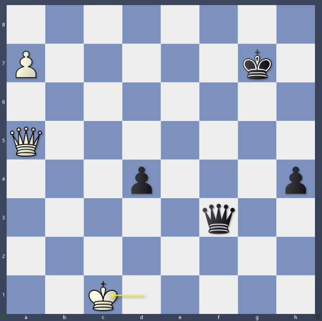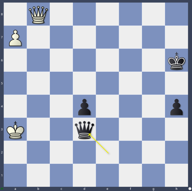 Encore une fois, il n’y a pas assez de temps pour bien jouer cette finale. Pour moi, les échecs allaient s’arrêter à un moment et il n’y aurait pas de perpétuel. Ce n’était pas tout à fait vrai, voici un exemple de la complexité des calculs : 61…De3+ 62.Rb2 De2+ 63.Rb3 Dd3+ 64.Rb4 Dd2+ 65.Rb5 De2+ 66.Rb6 De6+ 67.Rb7 De4+ 68.Ra6 et il n’y a effectivement plus d’échec salvateur (68…Dc6+ 69.Db6 Dc4+ 70.Rb7 Dd5+ 71.Dc6 ou 68…Dd3+ 69.Db5 Da3+ 70.Rb6). En revanche, et c’est vrai que c’est assez incroyable car le Roi blanc a l’air mieux placé en a6, 61…d3! sauve la mise, profitant du tempo offert. N’ayant pas compris cette subtilité, j’ai joué 61…Da8? sur la base d’un principe général, qui est que quand la Dame blanche arrive en b8, c’est beaucoup plus dur pour le Roi blanc d’échapper au perpétuel. En fait, ceci serait vrai sans le pion d4, mais pas ici, car après 62.Dc7+ Rh6 63.Db8 Dc6+ 64.Rb1! (64.Rb2? Dc3+ 65.Ra2 Da5+ et là, c’est perpét !) 64…De4+ 65.Rb2 De2+ 66.Ra3! (encore le seul coup pour s’échapper) 66…Dd3+